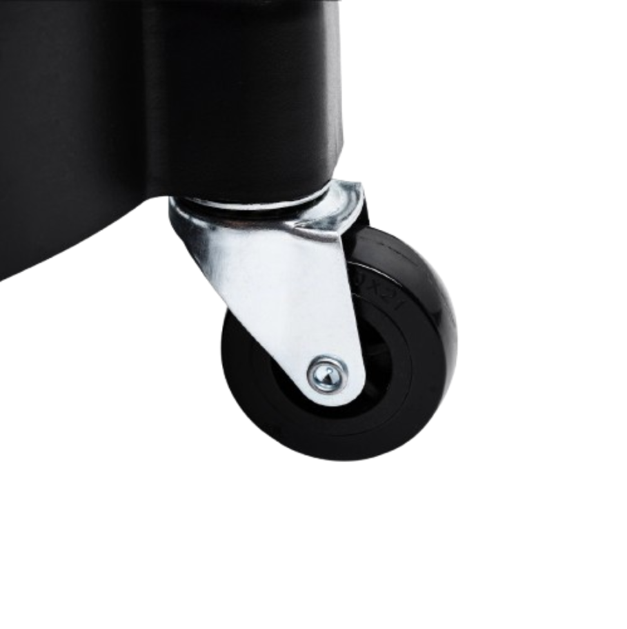 Die Grundlage der Mobilität des Wagens bildet ein System aus fünf robusten Lenkrollen (360°), von denen zwei mit Feststellbremsen ausgestattet sind. Die Fünf-Punkt-Basis erhöht im Gegensatz zu Vier-Rad-Systemen die Stabilität deutlich, was beim Manövrieren eines hohen, schweren, mit Flüssigkeit gefüllten Eimers entscheidend ist. Diese Konfiguration minimiert das Risiko des Umkippens und Verschüttens des Inhalts