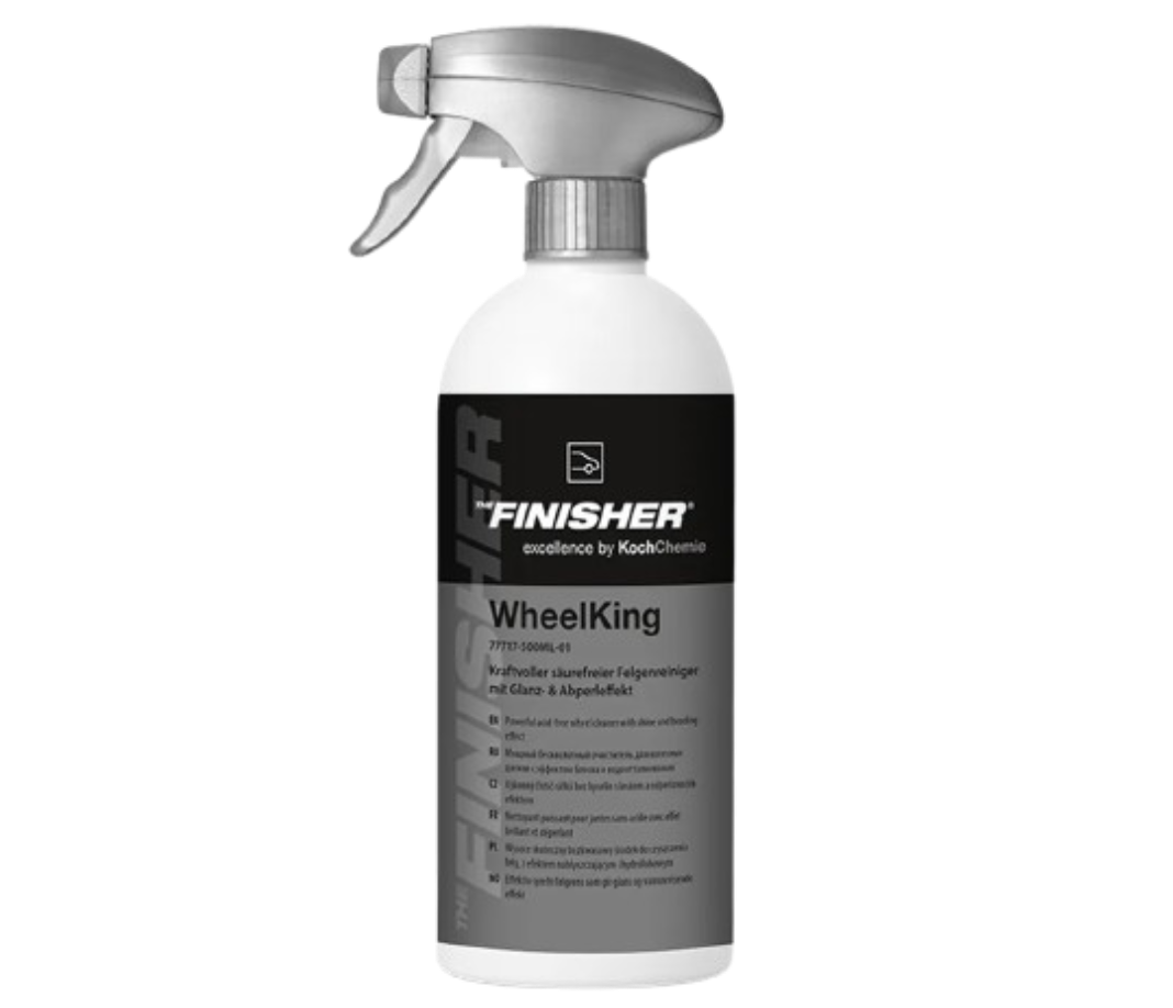 THE FINISHER “WheelKing” Felgenreiniger kombiniert reaktive Kraft mit geliger Haftung: Bremsstaub und Flugrost lösen sich sichtbar, Oberflächen bleiben geschützt. In den Vorwasch-/Wasch-Workflow eingebettet erreichst du schnell saubere, gleichmässig glänzende Felgen.
