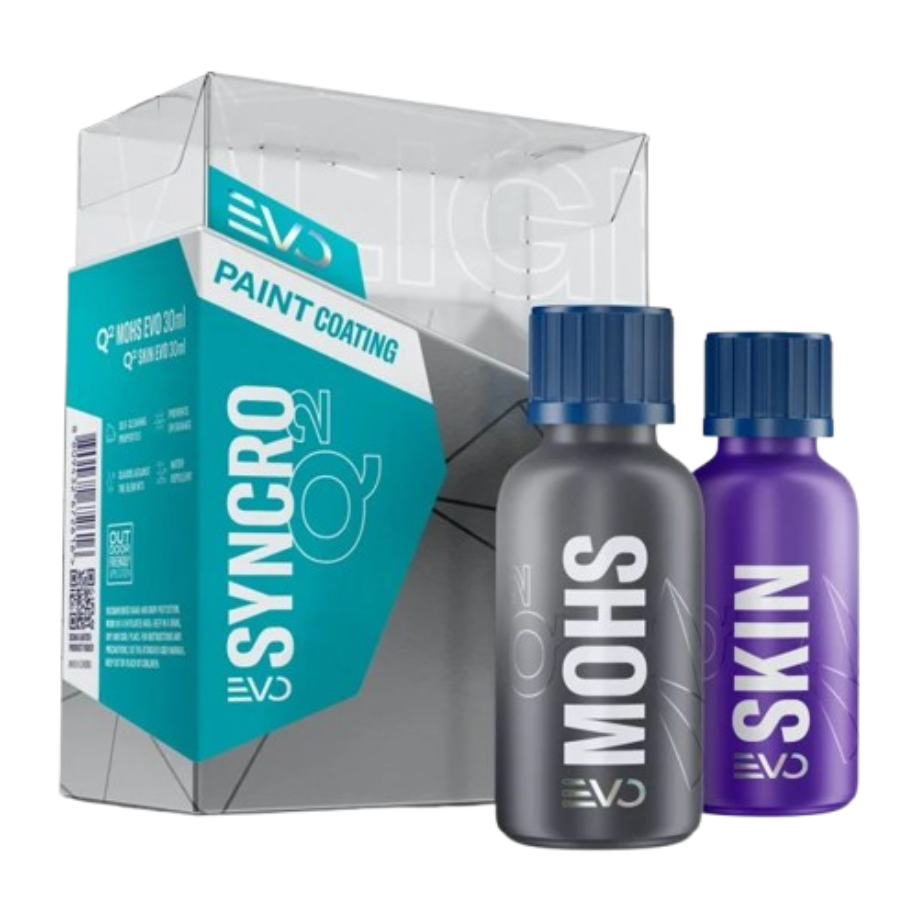 Q² Syncro EVO bietet eine einzigartige Möglichkeit, ein speziell entwickeltes Beschichtungssystem aufzutragen, das aus dem hochentwickelten Basis-Coating Q² Mohs EVO und dem Top-Coating Q² Skin EVO besteht. Dieses System erhöht massiv den Glanz und die Haltbarkeit des hydrophoben Effekts. Das Top-Coating sorgt zudem für eine sehr starke Farbverstärkung, die besonders auf dunklen Lacken deutlich sichtbar ist.